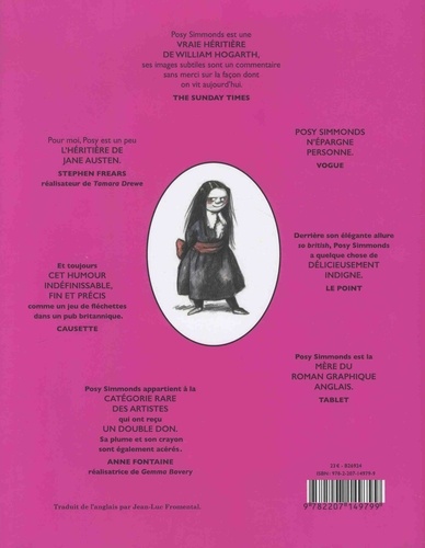 Célèbre au Royaume-Uni depuis les années 70 pour son travail de presse et sa longue collaboration avec le Guardian, quotidien de la classe moyenne progressiste britannique, Posy Simmonds n'a été révélée en France qu'à l'aube du XXIe siècle, avec la publication de son premier roman graphique, Gemma Bovery. Depuis, Tamara Drewe, Literary Life et Cassandra Darke ont paru ici, ainsi qu'une poignée d'albums jeunesse dont Fred, l'histoire d'un chat ordinaire le jour, rock star la nuit, ou le délicieux Chat du boulanger. Le public français ignore encore les deux tiers de l'oeuvre de cette artiste prolifique. Objet d'innombrables articles, de critiques et d'exégèses enthousiastes, le travail graphique de Posy n'avait encore jamais été rassemblé dans une monographie. C'est fait grâce à Paul Gravett, journaliste et critique anglais de bande dessinée, commissaire de nombreuses expositions - dont celle que le PULP Festival 2019 consacre en avril à Posy Simmonds, la première en France de cette importance. Proche de l'auteure, cet érudit du 9e Art réunit dans un ouvrage riche et concis un portrait intime et une étude en profondeur des méthodes de travail très spéciales de celle que la presse de son pays surnomme "la mère du roman graphique anglais" . On y découvre une Posy très drôle, d'une totale liberté de pensée, à la main sûre et à l'oeil acéré, redoutable caricaturiste de son temps, toujours lucide, jamais cruelle, fascinée par les rapports humains et les failles qui divisent sa société, riches contre pauvres, enfants contre parents, villes contre campagne, observatrice inlassable des grandeurs et vicissitudes de notre présent. Une artiste considérable qui s'inscrit dans la lignée des grands dessinateurs humoristes anglo-saxons tels William Hogarth, Osbert Lancaster, Ronald Searle ou Raymond Briggs. Cette promenade en 120 images dans la partie inexplorée de son oeuvre (incluant de très rares oeuvres de jeunesse) entraînera le flâneur français à la découverte de merveilles inconnues comme Les Trois Silencieuses de St Botolph, True Love ou Le Journal de Mrs Weber, qui font se tordre de rire ses contemporains depuis de longues décennies.