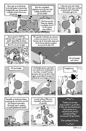 S O B est l'adaptation en bande dessinée d'une chanson de Mike Peck, compositeur/interprète américain. Boris Mirroir y distille ici son humour caractéristique, mêlé de mélancolie, tendresse et (auto)dérision. Plus qu'un touchant hommage à un artiste qu'il apprécie, Boris Mirroir signe là un ouvrage qui donne envie de se (re)plonger avec délection dans la découverte et l'écoute au long cours de musiques lointaines et colorées.