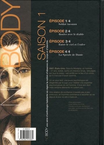 No Body est une série d'anthologie haletante où règne la notion d'absence de corps et d'identité. "Je ne suis pas fou, je suis cent pour cent coupable". 2007, états-Unis. Dans le Montana, un homme 57 ans, solide, cheveux longs, barbe touffue, tatouages sur tout le corps est arrêté sur le lieu d'un crime qu'il semble avoir commis. Un an plus tard, une jeune psychologue est diligentée par le tribunal pour réaliser une expertise psychologique de cet homme. Elle est jeune mais déterminée. Au fil de leurs échanges, il s'accuse du meurtre de son ancien coéquipier, selon lui, l'assassin de sa femme, et révèle qu'il l'a découpé en morceaux. Cependant, certains éléments ne collent pas... Une relation de confiance s'installe peu à peu entre eux, et l'homme commence à raconter sa vie depuis le jour où elle a basculé. Une révélation de la psychologue l'obligera finalement à regarder la vérité en face... Si les personnages et leur histoire sont fictifs, Cointelpro et le plan Northwoods sont réels, reconnus par les états-Unis et déclassifiés.