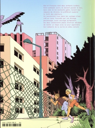 Bien que relativement indifférents quant à leur réussite scolaire, Gus et François sont deux brillants lycéens. Dans quelques jours, ils doivent passer le bac et l'on ne peut pas dire que cela les préoccupe véritablement. Heureusement, la horde de "clochards possédés" qui déferle sur la ville tous les soirs devrait pimenter un peu cette dernière semaine de révision. Qui sont-ils ?? Que veulent-ils ?? Il faut absolument partir à leur recherche pour essayer de comprendre ce phénomène stupéfiant. La piste débute à l'orée de la forêt qui borde les alentours. Alors que l'aventure ne fait que commencer, ils rencontrent Ivan dans ce qui semble être les vestiges d'une cité en ruine. Fascinés par cet étrange personnage, aussi sauvage qu'imposant, les deux adolescents pleins d'entrain décident de rester un temps avec lui pour découvrir les rudiments de la survie en milieu naturel. Derrière cette intrigue fantasque se niche un étonnant récit initiatique, naturaliste et existentialiste, égayé par la badinerie des deux jeunes personnages. Guère plus âgé qu'eux, Lucas Scholtes est étudiant aux Arts décoratifs de Strasbourg. Avec Solstice, sa première bande dessinée, il s'emploie à utiliser une grammaire narrative habile et moderne qui rappelle parfois le style fluide du manga et l'énergie du cinéma d'animation. Sur le plan graphique, il développe un univers riche et coloré qui met aussi bien en valeur la décrépitude urbaine que l'abondance des zones forestières.
