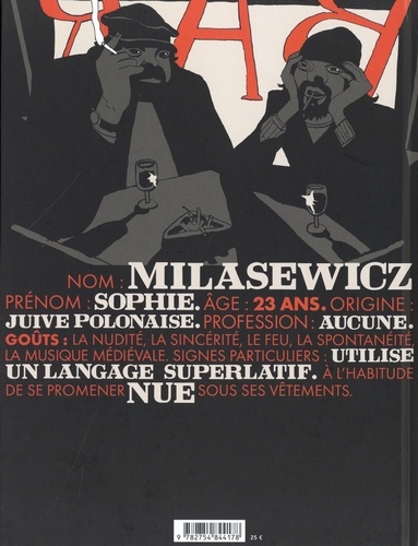 Nom : Milasewicz. Prénom : Sophie. Age : 23 ans. Origine : juive polonaise. Profession : aucune. Goûts : la nudité, la sincérité, le feu, la spontanéité, la musique médiévale. Signes particuliers : utilise un langage superlatif. A l'habitude de se promener nue sous ses vêtements. Sophie est une jeune femme incendiaire, fumant cigarette sur cigarette. Elle vit avec intensité, déteste les faux-semblants, s'accouple avec qui elle a envie. Elle veut être libre et maîtresse d'elle-même. Surtout, elle pleure sur le sort de l'humanité. Le destin de Sophie, jeune femme d'origine polonaise vivant aux Etats-Unis, exilée au Mexique, fait écho aux autres destins d'autres exilés qui ont fait le voyage inverse, et qui sont évoqués dans Sudor Sudaca. Sophie (paru chez Futuropolis en 1981) est l'une des premières femmes libre, rebelle, de la bande dessinée, icône des nouveaux rapports qui s'instauraient entre hommes et femmes à la fin du XX ? siècle. Cette nouvelle édition est complétée par Sudor Sudaca, deuxième livre du duo argentin, recueil d'histoires d'émigrés sur l'exil, publié en 1985. L'ouvrage comprend également les images du mythique portfolio Tango y milonga. Reflet de leur époque, ces deux récits sont sûrement les plus engagés du duo. Sophie est tout à la fois une critique virulente de l'impérialisme américain et son ingérence dans les pays d'Amérique du Sud (Mexique, Argentine...), et la défense de la rébellion comme seule possibilité d'un changement pour un monde meilleur.