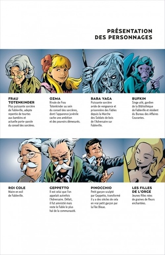 Alors que M. Dark a pris le contrôle des ruines de Fablevilleet que les Fables ignorent tout de ses projets et agissements, bufkin, le singe docile, se terre dans ce qui reste du Bureau des Affaires Courantes, enfermé aux côtés de la sorcière maléfique Baba Yoga et entend bien résister à l'ennemi. À la Ferme, Geppetto réapparaît et œuvre afin de devenir le chef des Fables et prendre le commandement des sorcières, mais saura-t-il convaincre la communauté de sa loyauté soudaine ? FABLES est une série née de l'imagination prolifique de Bill WILLINGHAM et de son amour pour les contes de fées. Plus proche d'ANDERSEN et des frères GRIMM que de Walt DISNEY, l'auteur accompagné au dessin par Jim FERN (CROSSING MIDNIGHT) David LAPHAM (THE SPIRIT, Wolverine) et Mark BUCKINGHAM, développe une version inédite, documentée et parfaitement-. vraisemblable des héros, créatures fabuleuses et monstres qui ont peuplé notre enfance.
