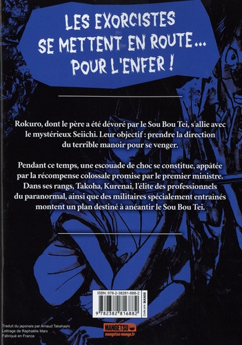 "Les exorcistes se mettent en route... pour l'enfer ! " Rokuro, dont le père à été dévoré par le Sou Bou Tei, s'allie avec le mystérieux Seiichi. Leur objectif : prendre la direction du terrible manoir pour se venger. Pendant ce temps, une escouade de choc se constitue, appâtée par la récompense colossale promise par le premier ministre. Dans ses rangs, Takoha, Kurenai, l'élite des professionnels du paranormal, ainsi que des militaires spécialement entraînés montent un plan destiné à anéantir le Sou Bou Tei. Une histoire d'horreur moderne à vous glacer le sang, signé Kazuhiro Fujita.