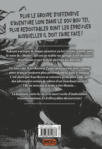 Plus le groupe d'offensive s'aventure loin dans le Sou Bou Tei, plus redoutables sont les épreuves auxquelles il doit faire face ! Rokurô a accepté de laisser pénétrer en lui l'entité connue sous le nom de Shino, qui est en réalité, un agrégat d'envahisseurs déterminés à tuer Seiichi par tous les moyens ! De leur côté, Kaerikuro et Zanka poursuivent leur combat pour avancer toujours plus profondément dans le manoir. C'est alors que Kaerikuro se retrouve prise pour cible par des adversaires armés de sabres d'un tranchant mortel. Elle ne sera pas la seule à être blessée... La frontière entre la vie et la mort recèle d'inattendues transformations. Et d'effroyables découvertes !