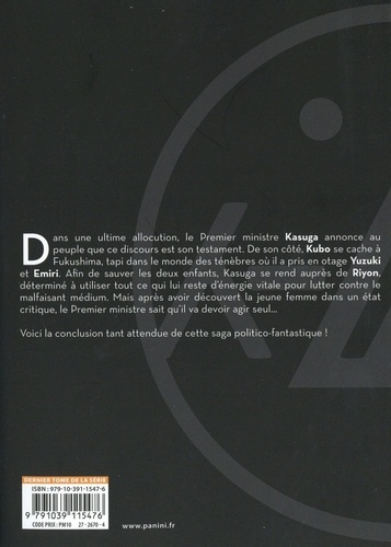 Dans une ultime allocution devant la Diète médusée, le Premier ministre Kasuga annonce au peuple : "Ce discours est mon testament. "... Pendant ce temps, Kubo s'est caché à Fukushima, où il a pris en otage Yuzuki et Emiri. Afin de sauver les deux enfants, Kasuga se rend auprès de Riyon, déterminé à utiliser tout ce qui lui reste d'énergie vitale contre le malfaisant médium, mais il découvre la jeune femme dans un état critique. Le Premier ministre va donc devoir agir seul. Voici la conclusion tant attendue de cette saga politico-fantastique ! La réputation de Tsutomu Takahashi n'est plus à faire : le célèbre mangaka est l'auteur de Blue Heaven, Sidooh, Neun, Black Box... Il nous offre avec Soul Keeper une intrigue aussi originale qu'étonnante, mêlant fantastique et intrigue politique.