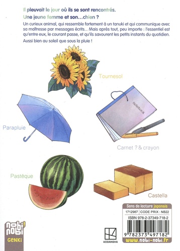 Il pleuvait le jour où ils se sont rencontrés. Une jeune femme et son... chien ? Un curieux animal, qui ressemble fortement à un tanuki et qui communique avec sa maîtresse par messages écrits... Mais après tout, peu importe : l'essentiel est qu'entre eux, le courant passe, et qu'ils savourent les petits instants du quotidien : les balades dans le quartier, les visites chez le vétérinaire, la dégustation de tempura ou encore les journées à la plage. Aussi bien au soleil que sous la pluie ! Dans cette délicate série au trait raffiné, Ko Nikaido dépeint les moments précieux d'un duo attachant, oscillant entre drôlerie et tendresse.
