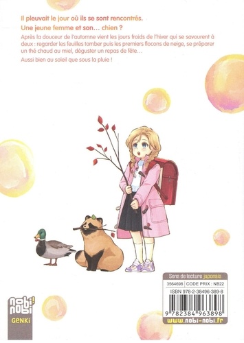Il pleuvait le jour où ils se sont rencontrés. Une jeune femme et son... chien ? Un curieux animal, qui ressemble fortement à un tanuki et qui communique avec sa maîtresse par messages écrits... Mais après tout, peu importe : l'essentiel est qu'entre eux, le courant passe, et qu'ils savourent les petits instants du quotidien : regarder les feuilles tomber puis les premiers flocons de neige, boire un thé chaud au miel, dîner avec des amies... Aussi bien au soleil que sous la pluie !
