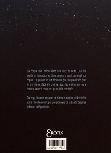 Des histoires de sexe et de sentiments inspirées de faits réels, à mi-chemin entre la bande dessinée d'auteur et l'érotisme. Par l'une des pionnières du genre, l'Italienne Laura Scarpa. Les histoires de ce recueil ont été créés pour le magazine italien Blue, dans les années 90. Elles relatent des faits réels vécus par L. Scarpa ou ses amies. Emportés par le désir, des couples font l'amour dans des lieux publics, sur la plage, au cinéma, dans les églises. Ces histoires, riches en sentiments et en humanité, consituent l'une des premières incursions de la BD d'auteur dans l'érotisme.
