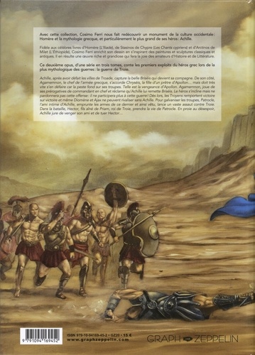 Ce deuxième opus, d'une série en trois tomes, conte les premiers exploits du héros grec lors de la plus mythologique des guerres : la guerre de Troie. Achille, après avoir refait les villes de Troade, capture la belle Briséis qui devient sa compagne. De son côté, Agamemnon, le chef de l'armée grecque. s'accorde Chryséis, la fille d'un prêtre d'Apollon... mais doit très vite s'en défaire car la peste fond sur ses troupes. Telle est la vengeance d'Apollon. Agamemnon, joue de ses prérogatives de commandant en chef et réclame qu'Achille lui remette Briséis. Le héros s'incline mais ne pardonnera pas cette offense : il ne participera plus cette guerre ! Dès lors, les Troyens rempotent victoire sur victoire, et même Diomède et Ajax ne peuvent rivaliser sans Achille. Pour galvaniser les troupes, Patrocle, l'ami intime d'Achille, emprunte les armes de ce dernier et ainsi vêtu, lance un vaste assaut contre Troie. Dans la bataille. Hector, fils aîné de Priam, roi de Troie, prendra la vie de Patrocle. En proie au désespoir, Achille jure de venger son ami et de tuer Hector...