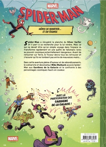 Spider-Man a récupéré la planche du Silver Surfer et il part à sa recherche pour la lui rendre. Mais ce qui ne devait être qu'un simple voyage dans l'espace se transforme rapidement en une quête de talismans rares au pouvoir cosmique potentiellement dangereux. Avant de retourner sur Terre, le Tisseur devra tous les retrouver et s'assurer qu'ils ne tombent pas entre de mauvaises mains... Dans cette aventure pleine d'humour et de rebondissements, le scénariste et dessinateur Mike Maihack associe Spider-Man aux Gardiens de la Galaxie et le confronte à des personnages cosmiques hauts en couleur.