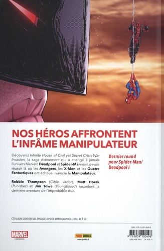 Nos héros affrontent l'infâme manipulateur. Découvrez Infinite House of Civil yet Secret Crisis War Invasion, la saga événement qui a changé à jamais l'univers Marvel ! Deadpool et Spider-Man vont devoir réussir là où les Avengers, les X-Men et les Quatre Fantastiques ont échoué : vaincre le Manipulateur. Dernier round Robbie Thompson (Cible Vador), Matt Horak (Punisher) et Jim Towe (Youngblood) racontent la dernière aventure de l'improbable duo. pour Spider-Man/ Deadpool. Cet album contient les épisodes Spider-man/Deadpool (2016) 46 à 50.