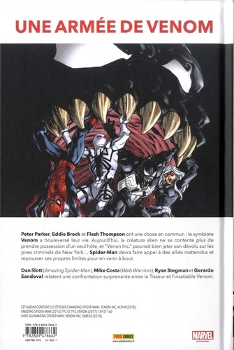 Une armée de Venom. Peter Parker, Eddie Brock et Flash Thompson ont une chose en commun : le symbiote Venom a bouleversé leur vie. Aujourd'hui, la créature alien ne se contente plus de prendre possession d'un seul hôte, et "Venom Inc." pourrait bien jeter son dévolu sur les pires criminels de New York... Spider-Man devra faire appel à des alliés inattendus et repousser ses propres limites pour en venir à bout. Dan Slott (Amazing Spider-Man), Mike Costa (Web Warriors), Ryan Stegman et Gerardo Sandoval relatent une confrontation surprenante entre le Tisseur et l'insatiable Venom. Cet album contient les épisodes Amazing Spider-Man : Venom Inc. Alpha (2018), Amazing Spider-Man (2015) 792 et 793, Venom (2018)159 et 160 ainsi qu'Amazing Spider-Man : Venom Inc Omega (2018).