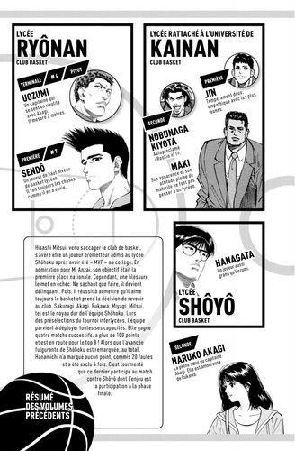 Voici enfin de retour, dans une toute nouvelle édition, les aventures de Sakuragi qui se lance dans le basket-ball ! Même si au départ, il le fait pour épater la belle Haruko, il va se prendre au jeu et découvrir que se dépasser est la plus belle des motivations ! Slam dunk est devenue la référence ultime du manga de basket-ball pour ne pas dire la référence du manga de sport ! Parfait mélange d'action, d'humour, de romance, de rivalités dans un contexte sportif, jamais lourd, le tout servi par un dessin sublime de Takehiko Inoue. Cette édition en 20 volumes bénéficie de toutes nouvelles jaquettes dessinées spécialement par l'auteur.