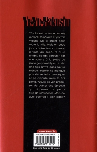 Yusuke Urameshi, 14 ans est un adolescent rebelle, allergique à l'autorité. En voulant sauver un enfant, il est victime d'un accident de la circulation qui lui coûte la vie ! Comme sa mort n'a pas été prévue par le roi Emma, celui-ci décide de lui donner une chance de revenir à la vie en le mettant à l'épreuve. Il accompagne Botan, la Guide des Voies Célestes. A eux deux, ils viennent en aide aux fantômes égarés ou à des âmes en perdition. Le Royaume a décidé de ressusciter Yusuke et de le faire revenir sur Terre. En contrepartie, Yusuke se voit confier un nouveau rôle, celui de détective /chasseur de fantômes pour le compte du Royaume. Redécouvrez cette série culte avant Hunter X hunter, de l'action en perspective !!