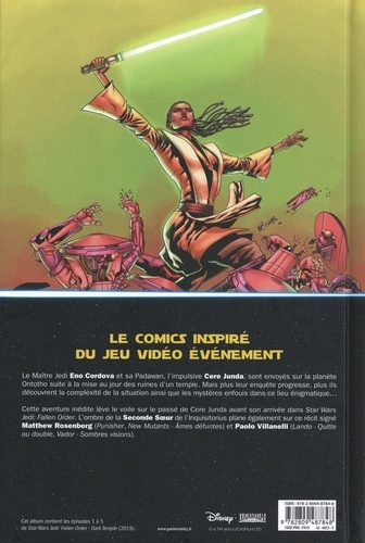 Le comics inspiré du jeu vidéo événement. Le Maître Jedi Eno Cordova et sa Padawan, l'impulsive Cere Junda, sont envoyés sur la planète Ontotho suite à la mise au jour des ruines d'un temple. Mais plus leur enquête progresse, plus ils découvrent la complexité de la situation ainsi que les mystères enfouis dans ce lieu énigmatique... Cette aventure inédite lève le voile sur le passé de Cere Junda avant son arrivée dans Star Wars Jedo Fallen Order. L'ombre de la Seconde Soeur de l'Inquisitorius plane également sur ce récit signé Matthew Rosenberg (Punisher, New Mutants - Ames défuntes) et Paolo Villanelli (Lando - Quitte ou double, Vador - Sombres visions). Cet album contient les épisodes 1 à 5 de Star Wars Jedi : Fallen Order : Dark Temple (2019).