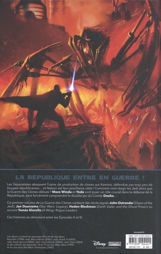 La guerre fait trembler la République ! Alors que la galaxie est plongée dans le conflit, les séparatistes veulent détruire l'usine de clonage de la République et seul un escadron de Starfighters ainsi qu'un bataillon de Jedi peuvent les arrêter. Comment Obi-Wan Kenobi et Anakin Skywalker réagissent-ils à la guerre ? Ce ne sont que quelques-uns des nombreux récits recueillis ici. Les archives Marvel regorgent d'excellentes sagas consacrées à l'univers Star Wars, et nous vous les proposons en parallèle de la publication des nouvelles séries. On s'intéresse ici à l'une des périodes favorites des fans, celle de la Guerre des Clones qui sépare les épisodes 2 et 3 de la saga cinématographique. Contient : Republic #49-54 (Le sacrifice, La défense de Kamino, Le nouveau visage de la guerre, Dans le rayon de l'explosion, Fugitif), Le schisme (Star Wars - Clone Wars T01), Patte de velours (Star Wars - Clone Wars T02), Aayla Secura, Dooku (Star Wars - Clone Wars T04), Vagues de terreur ; La lumière au milieu des ténèbres (Star Wars - Clone Wars T07) et The Artist of Naboo (inédit).