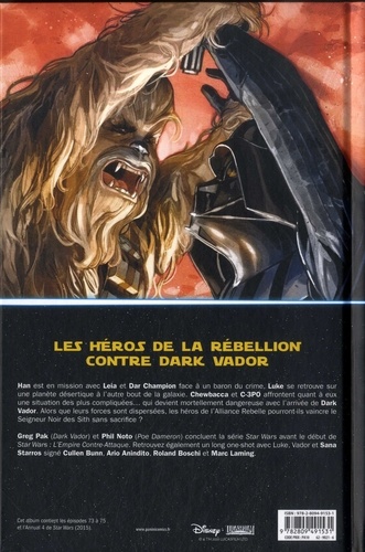 La tension monte et tout se joue dans ce nouvel opus des aventures de Luke Skywalker et de ses amis. Au programme : la vérité sur l'énigmatique Dar Champion, les secrets de Warba dévoilés, un combat à mains nues entre Chewbacca et Dark Vador, et surtout la convergence de toutes les trames tissées jusque-là, pour un affrontement final qui ne laissera personne indemne. En bonus, une série d'histoires courtes autour de l'univers Star Wars ! Depuis qu'elle a été lancée en 2015, la série Star Wars a conquis les fans de l'univers, avec des aventures passionnantes comblant les espaces laissés vides par la première trilogie de George Lucas. Ce voyage touche à sa fin avec cet album qui fait le pont entre les deux premiers chapitres de la saga cinématographique. Mais ça n'est évidemment pas la fin pour l'univers Star Wars en comics, puisque la nouvelle série éponyme fera son apparition en albums en 2021 !
