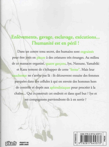 Enlèvements, gavage, esclavage, exécutions... l'humanité est en péril ! Dans un centre tenu secret, des humains sont engraissés pour être jetés en pâture à des créatures très étranges. Au milieu de ce massacre organisé, quatre garçons, Iye, Natsune, Yamabiki et Kazu tentent de s'échapper de cette " ferme ". Mais leur cauchemar ne s'arrête pas là : ils découvrent ensuite des femmes parquées dans des cellules à qui on envoie des hommes hors de contrôle et dopés aux aphrodisiaques pour procréer à la chaîne... Qui a construit cet endroit et dans quel but ? Iye et ses compagnons parviendront-ils à en sortir ?