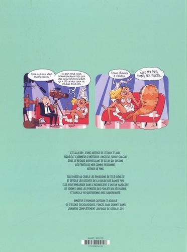 Stella Lory Jeune autrice de l'écurie Fluide. Nous fait l'honneur d'intégrer l'institut Fluide Glacial sous le regard bienveillant de celui qui dessine les fruits de mer comme personne : Arthur de Pins. Elle passe au crible les émissions de télé-réalité et dévoile les secrets de la guilde des dames pipi. Elle vous embarque dans l'inconscient d'un fan hardcore de Johnny. Dans les pensées des poulets en rôtisserie et dans la vie quotidienne avec saugrenuité. Amateur d'humour cartoon et acidulé ou d'essais sociologiques, foncez sans crainte dans l'univers complètement loufoque de Stella Lory.