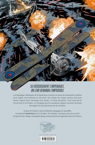 Si vous réalisez un peu trop souvent des exploits incroyables, ils finiront par vous demander de faire l'impossible. Les équipages embarqués de la Royal Navy n'avaient en guise de bombardier-torpilleur qu'un biplan sous-motorisé et mal armé, une relique des temps anciens tout juste bonne à figurer dans l'inventaire d'un musée : le Fairey Swordfish. C'est à bord de ce tas de bois et de ficelles, ce Stringbag, que les escadrons anglais écrivirent certaines des pages les plus glorieuses de leur histoire. A partir de l'histoire vraie de différents équipages de Swordfish, le scénariste Garth Ennis (The Preacher, The Boys) nous livre un récit de guerre et de courage, une épopée épique, assaisonné de son légendaire sens de l'humour.