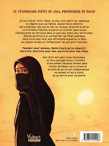 Un soir d'août 2014, Sana, 15 ans, croit partir en vacances en Algérie avec sa famille. Quand l'avion atterrit elle comprend : elle est en fait en Turquie, direction la Syrie. La frontière franchie, à pied et en courant dans la nuit, l'adolescente se retrouve dans un pays aux mains des terroristes. Mariée de force à un combattant de l'Etat islamique, mère un an plus tard, elle affrontera la guerre, la faim, les camps kurdes et l'effacement de son droit d'exister, Pendant neuf années, Sana n'aura qu'un objectif : survivre. Survivre pour elle, survivre pour ses filles. Son récit est celui d'une résistance et d'un courage inouïs. L'histoire d'une enfant devenue femme dans l'enfer de Daesh, qui a conservé au péril de sa vie son indépendance de penser, et qui a choisi de se battre pour sa liberté.