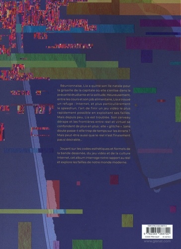Réunionnaise, Lia a quitté son île natale pour la grisaille de la capitale où elle s'enlise dans la précarité étudiante et la solitude. Heureusement, entre les cours et son job alimentaire, Lia a trouvé un refuge : Internet et plus particulièrement le speedrun l'art de finir un jeu vidéo le plus rapidement possible en exploitant ses failles. Mais depuis peu, Lia est troublée. Son cerveau dérape et les frontières entre réel et virtuel se confondent de plus en plus : elle "glitche". Sans doute passe-telle trop de temps sur les écrans ? Mais peut-être aussi que le réel n'est finalement pas si désirable... Jouant sur les codes esthétiques et formels de la bande dessinée, du jeu vidéo et de la culture Internet, cet album interroge notre rapport au réel et explore les failles de notre monde moderne.