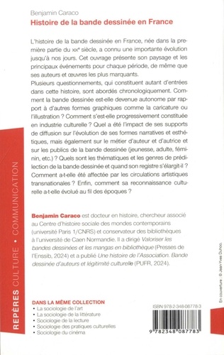 L'histoire de la bande dessinée en France, née dans la première partie du XIXe siècle, a connu une importante évolution jusqu'à nos jours. Cet ouvrage présente son paysage et les principaux événements pour chaque période, de même que ses auteurs et oeuvres les plus marquants. Plusieurs questionnements, qui constituent autant d'entrées dans cette histoire, sont abordés chronologiquement. Comment la bande dessinée est-elle devenue autonome par rapport à d'autres formes graphiques comme la caricature ou l'illustration ? Comment s'est-elle progressivement constituée en industrie culturelle ? Quel a été l'impact de ses supports de diffusion sur l'évolution de ses formes narratives et esthétiques, mais également sur le métier d'auteur et d'autrice et sur les publics de la bande dessinée (jeunesse, adulte, féminin, etc.) ? Quels sont les thématiques et les genres de prédilection de la bande dessinée et quand son registre s'élargit-il ? Comment a-t-elle été affectée par les circulations artistiques transnationales ? Enfin, comment sa reconnaissance culturelle a-t-elle évolué au fil des époques ?