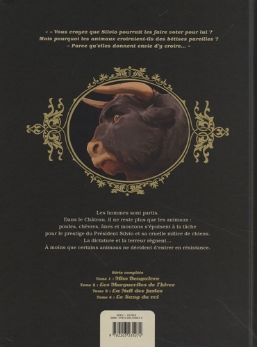 C'est une petite victoire pour les animaux : le dictateur Silvio a dû se résoudre à organiser un vote... et donc peut-être à remettre son mandat en jeu ! Au Château, la campagne pour l'élection présidentielle bat son plein, et du côté du taureau-despote, tous les coups (bas) sont permis. Mais le Mouvement des Marguerites est plus mobilisé que jamais pour renverser le taureau dictateur, bien décidé aussi à rappeler toutes les injustices dont sont victimes les animaux ! Miss B, César et Azélar auront-ils raison du cruel taureau Silvio ? La liberté est-elle à portée de pattes ?
