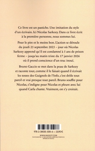 Le Livre pastiche - écrit en même temps que celui de Nicolas Sarkozy - par l'auteur des Guignols de l'Info, Bruno Gaccio Ce livre est un pastiche. Une imitation du style d'un écrivain. Ici Nicolas Sarkozy. Dans ce livre écrit à la première personne, nous sommes lui. Pour le pire et le moins bon. L'action se déroule du jeudi 25 septembre 2025 - jour où Nicolas Sarkozy apprend qu'il est condamné à 5 ans de prison ferme - jusqu'au matin triste du 17 janvier 2026 où il prend conscience d'un truc inouï. Bruno Gaccio se met dans la peau de Sarkozy et raconte tout, comme il le faisait quand il écrivait les textes des Guignols de l'Info, c'est drôle tout pareil et vrai presque tout pareil. Bruno souffre pour Nicolas, s'indigne pour Nicolas et pleure avec lui quand Carla chante. Vraiment, on s'y croirait.