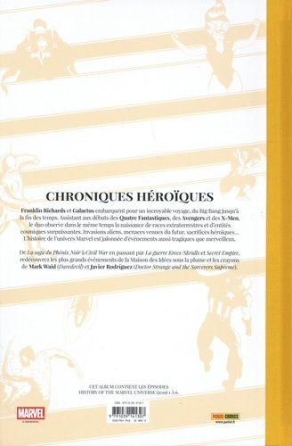 Depuis toujours, une question hante les lecteurs de comics : "Si je veux comprendre l'univers Marvel, par où dois je commencer ? " La réponse se trouve ici, dans une saga qui retrace TOUTE l'histoire de Marvel, du Big Bang jusqu'à la fin des temps. Une tâche titanesque, et pourtant réussie : même les lecteurs les plus chevronnés y découvriront encore des révélations. Raconter de manière exhaustive l'histoire de l'univers Marvel ? C'était un pari insensé. Mark Waid (Daredevil, Captain America) et Javier Rodríguez (Defenders, Doctor Strange and the Sorcerers Supreme) l'ont relevé ! Nous rassemblons cette fresque monumentale dans un format prestigieux, à la hauteur de cette oeuvre unique.