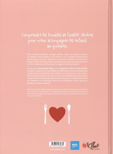 Comprendre les troubles de l'oralité sévères pour mieux accompagner les enfants au quotidien. Pour certains enfants, manger, goûter, sentir ou même toucher un aliment peut devenir une épreuve. Les troubles alimentaires pédiatriques, souvent méconnus, touchent pourtant de nombreux enfants dont l'environnement, les émotions ou des parcours de soins parfois complexes influencent le rapport à l'alimentation. Conçu par l'association Kiwi et les Hospices Civils de Lyon (CHU), cet album explore avec sensibilité ces difficultés souvent invisibles qui bouleversent le quotidien des Familles. Les histoires de Lola, Simon, Ambrent Kais, inspirées du vécu d'enfants hospitalisés, invitent à mieux comprendre le ressenti des enfants touchés par les troubles de l'oralité et proposent un éclairage pour les accompagner avec douceur, patience et bienveillance.