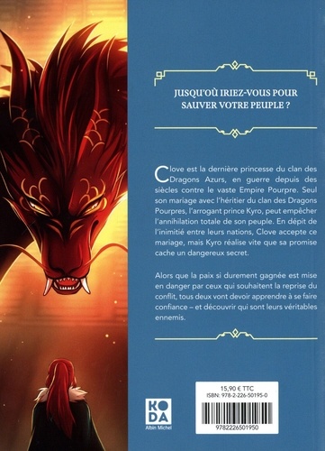 JUSQU'OU IRIEZ-VOUS POUR SAUVER VOTRE PEUPLE ? Clove est la dernière princesse du clan des Dragons Azurs, en guerre depuis des siècles contre le vaste Empire Pourpre. Seul son mariage avec l'héritier du clan des Dragons Pourpres, l'arrogant prince Kyro, peut empêcher l'annihilation totale de son peuple. En dépit de l'inimitié entre leurs nations, Clove accepte ce mariage, mais Kyro réalise vite que sa promise cache un dangereux secret. Alors que la paix si durement gagnée est mise en danger par ceux qui souhaitent la reprise du conflit, tous deux vont devoir apprendre à se faire confiance - et découvrir qui sont leurs véritables ennemis.