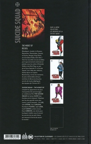 Bloodsport, Javelot, le Penseur, Ratcatcher, Peacemaker, Savant, la Fouine, Mongal, King Shark, et le terrifiant Polka-Dot-Man ! Voici les nouvelles recrues enrôlées par le gouvernement américain et placées sous les ordres d'Amanda Waller et de Rick Flag, au sein de la Force Spéciale X, la Suicide Squad ! Aux côtés des vétérans, Harley Quinn et Captain Boomerang, revivez les moments les plus mémorables de leurs carrières et découvrez les pires secrets de la plus déglinguée des équipes de l'Univers DC, révélés par les plus grands noms des comics, parmi lesquels : Jim LEE, John BYRNE, Dan JURGENS, Humberto RAMOS, Jeph LOEB, Geoff JOHNS ou bien encore Dave GIBBONS !