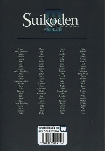 Etes-vous prêt pour une aventure exceptionnelle ? Retrouvez dans une toute nouvelle édition l'adaptation fidèle en manga du célèbre jeu vidéo RPG de Konami, Suikoden III ! La guerre fait rage depuis des lustres entre les Grasslands et les Zexen. De chaque côté, les jeunes générations sont formées pour défendre leur clan. Victimes de cette guerre fratricide, la frêle Chris et le jeune Hugo devront se battre jusqu'à la mort. Derrière ce conflit se cache cependant la quête des True Rune, conférant à leurs possesseurs des pouvoirs inimaginables.
