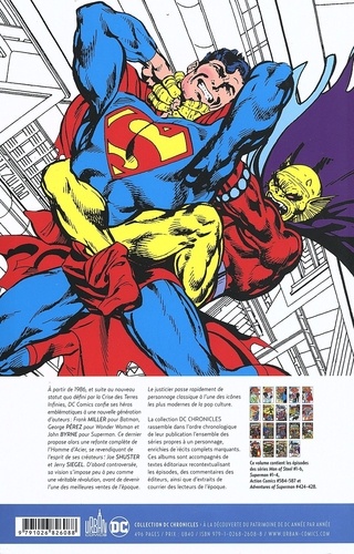 Metropolis était autrefois le terrain de chasse privilégié de Lex Luthor, le P. D-G. tyrannique et intransigeant de la multinationale LexCorp, mais l'arrivée d'un protecteur surhumain a changé la donne... Partageant son temps entre son identité de Clark Kent, jeune reporter pour le Daily Planet, et celle de Superman, défenseur des opprimés, il combat les menaces les plus étranges et les plus terrifiantes : Metallo, Darkseid ou Bizarro ! Après BATMAN, c'est au tour de SUPERMAN de se décliner au format CHRONICLES, avec les épisodes des années 1980 qui ont inspiré la série animée de Bruce TIMM et la série télévisée LOIS & CLARK !
