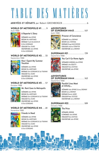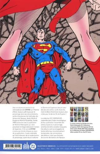 Avec ce volume se conclut le run mémorable de John BYRNE sur l'Homme d'Acier, toujours prêt pousser le personnage dans ses retranchements, quitte à bouleverser les habitudes des lecteurs de l'époque. Après World of Krypton, et World of Smallville, l'année 1988 se termine avec la publication de World of Metropolis qui vient parachever la trilogie redessinant l'univers de Supermen. Si le run de BYRNE a connu son lot de critiques ou murs de sa publication, il reste indéniable qu'il est le berceau de la modernisation du personnage, ayant réussi d rallume, la flamme de Superman dons le coeur des fans de comics. La fin d'une ère. mais le début d'aventures toujours plus riches pour le demie, fils de Krypton ! La collection DC CHRONICLES rassemble dans l'ordre chronologique de leur publication l'ensemble des séries propres un personnage, enrichies de récits complets marquants. Ces albums sont accompagnés de textes éditoriaux recontextualisant les épisodes, de commentaires des éditeurs, ainsi lue d'extraits de courrier de, lecteur, de l'époque.