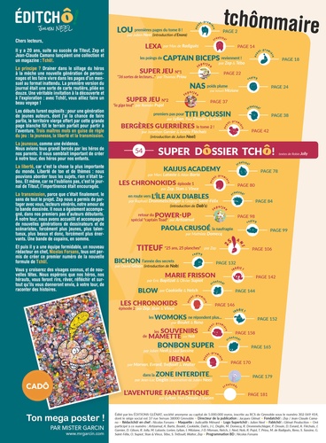 Grandir, avec imagination ! Esprit Tchô! . Des héros populaires, de l'humour, de l'aventure, des thématiques fortes portées par une vraie forme d'irrévérence... Depuis 20 ans, la génération "Tchô! " porte en elle des valeurs toujours en mouvement, toujours modernes. Un état d'esprit né en 1998 avec Zep dont Titeuf fut le fer de lance pour faire rire et rêver tant de lecteurs. Le mégazine Tchô! s'est arrêté en 2013 sur un au revoir qu'une nouvelle génération d'auteurs est bien décidée à faire oublier. Dans ce troisième numéro de Supertchô, retrouvez vos personnages favoris mais aussi les héros de demain à travers 150 pages de bande dessinée : de la création, mais aussi de nouvelles séries en prépublication exclusive ! BD, jeux, anecdotes, informations exclusives... Avec Supertchô, "l'esprit Tchô! " renaît, plus vivant que jamais. Peut-être même est-il en train d'entrer dans une nouvelle ère ?