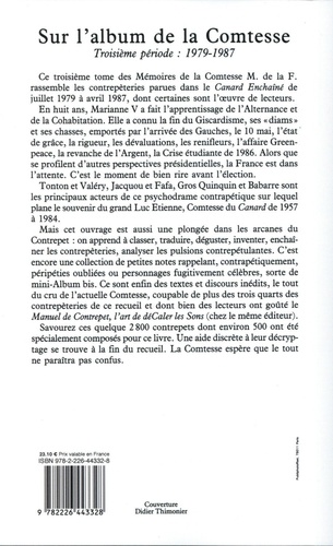 Ce troisième tome des Mémoires de la Comtesse M. de la F. rassemble les contrepèteries parues dans le Canard Enchaîné de juillet 1979 à avril 1987, dont certaines sont l'oeuvre de lecteurs. En huit ans, Marianne V a fait l'apprentissage de l'Alternance et de la Cohabitation. Elle a connu la fin du Giscardisme, ses "diams" et ses chasses, emportés par l'arrivée des Gauches, le 10 mai, l'état de grâce, la rigueur, les dévaluations, les renifleurs, l'affaire Greenpeace, la revanche de l'Argent, la Crise étudiante de 1986. Alors que se profilent d'autres perspectives présidentielles, la France est dans l'attente. C'est le moment de bien rire avant l'élection. Tonton et Valéry, Jacquou et Fafa, Gros Quinquin et Babarre sont les principaux acteurs de ce psychodrame contrapétique sur lequel plane le souvenir du grand Luc Etienne, Comtesse du Canard de 1957 à 1984. Mais cet ouvrage est aussi une plongée dans les arcanes du Contrepet : on apprend à classer, traduire, déguster, inventer, enchaîner les contrepèteries, analyser les pulsions contrepétulantes. C'est encore une collection de petites notes rappelant, contrapétiquement, péripéties oubliées ou personnages fugitivement célèbres, sorte de mini-Album bis. Ce sont enfin des textes et discours inédits, le tout du cru de l'actuelle Comtesse, coupable de plus des trois quarts des contrepèteries de ce recueil et dont bien des lecteurs ont goûté le Manuel de Contrepet, l'art de déCaler les Sons (chez le même éditeur).