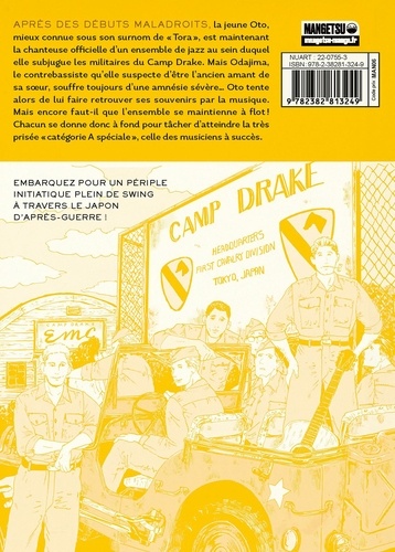 Après des débuts maladroits, la jeune Oto, mieux connue sous son surnom de "Tora" , est maintenant la chanteuse officielle d'un ensemble de jazz au sein duquel elle subjugue les militaires du Camp Drake. Mais Odajima, le contrebassiste qu'elle suspecte d'être l'ancien amant de sa soeur, souffre toujours d'une amnésie sévère... Oto tente alors de lui faire retrouver ses souvenirs par la musique. Mais encore faut-il que l'ensemble se maintienne à flot ! Chacun se donne donc à fond pour tâcher d'atteindre la très prisée "catégorie A spéciale" , celle des musiciens à succès. " ... les mises en scènes sont plutôt bien pensées ; notamment en ce qui concerne la musique. On trouve ainsi des métaphores visuelles chargées d'émotions, ainsi que des concerts à l'euphorie contagieuse". Gaak. fr " Une vraie bouffée d'air frais". Les Blasblas de Tachan " Au fil de ce premier tome déjà riche et mené tambour battant, Koukou Haida trouve un parfait équilibre entre les différentes facettes de son oeuvre et nous y entraîne totalement". Manga-news. com