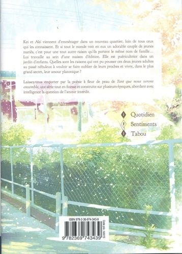 Kei et Aki viennent d'emménager dans un nouveau quartier, loin de tous ceux qui les connaissent. Et si tout le monde voit en eux un adorable couple de jeunes mariés, c'est pour une tout autre raison qu'ils portent le même nom de famille... Lui travaille au sein d'une maison d'édition. Elle est puéricultrice dans un jardin d'enfants. Quelles sont les raisons qui ont pu pousser ces deux jeunes adultes au passé nébuleux à vouloir se faire oublier de leurs proches et vivre, dans le plus grand secret, leur amour platonique ?