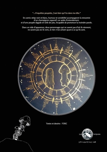 En comic strips noir et blanc, humour et sensibilité s'assortissent à la rencontre d'un champignon expansif, car avide d'entendement, et d'une poupée dagyde en toile de jute, incapable de prononcer la moindre parole. Dans un vide d'apparence, deux personnages qui ne savent pas d'où ils viennent, ne savent pas où ils vont, et rien n'est certain quant à ce qu'ils sont.