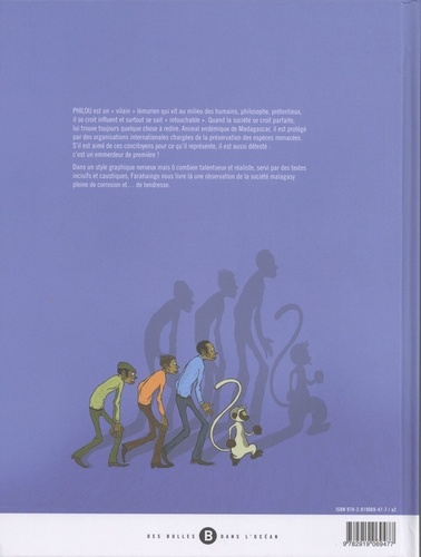 Philou est un "vilain" lémurien qui vit au milieu des humains, philosophe, prétentieux, il se croit influent et surtout se sait "intouchable". Quand la société se croit parfaite, lui trouve toujours quelque chose à redire. Animal endémique de Madagascar, il est protégé par des organisations internationales chargées de la préservation des espèces menacées. S'il est aimé de ces concitoyens pour ce qu'il représente, il est aussi détesté : c'est un emmerdeur de première ! Dans un style graphique nerveux mais ô combien talentueux et réaliste, servi par des textes incisifs et caustiques, Farahaingo nous livre là une observation de la société malagasy pleine de corrosion et... de tendresse.