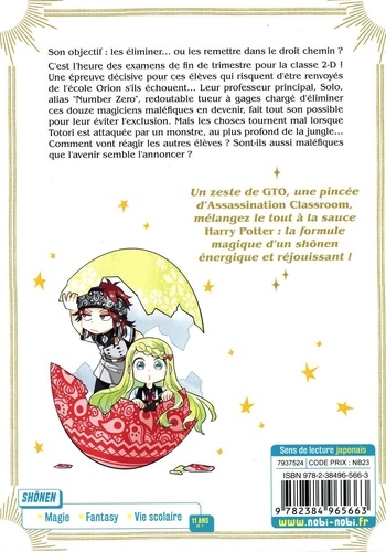 Son objectif : les éliminer... ou les remettre dans le droit chemin ? C'est l'heure des examens de fin de trimestre pour la classe 2-D ! Une épreuve décisive pour ces élèves qui risquent d'être renvoyés de l'école Orion s'ils échouent... Leur professeur principal, Solo, alias "Humber Zero", redoutable tueur à gages chargé d'éliminer ces douze magiciens maléfiques en devenir, fait tout son possible pour leur éviter l'exclusion. Mais les choses tournent mal lorsque Toton est attaquée par un monstre, au plus profond de la jungle... Comment vont réagir les autres élèves ? Sont-ils aussi maléfiques que l'avenir semble l'annoncer ? Un zeste de GTO, une pincée d'Assassination Classroom, mélangez le tout à la sauce Harry Potter : la formule magique d'un shônen énergique et réjouissant !