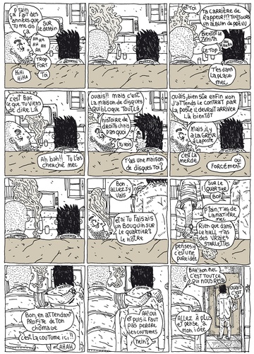 "C'était pas prévu que je perde mon boulot et puis c'est peut-être mieux comme ça. je vais avoir 40 piges, je vais ou, je vais faire quoi ?" Parallèlement à sa passion pour le dessin et la bande dessinée, Gilles Rochier avait un autre boulot - et des responsabilités -, stressant, qui l'occupait largement et à plus que plein temps. Pas de temps à consacrer à soi, à ses amis, peu à sa famille. Un jour, sa boîte coule... Plus rien a quoi se raccrocher, l'impression que le sol se dérobe... la depression l'engouffre. Heureusement la passion du dessin est là, il s'y raccroche, fait un break, le justifie auprès des autres par son "statut" de dessinateur, auprès de lui surtout. Il est urgent de faire un "temps mort". Réapprendre à vivre sans s'oublier dans douze heures de travail quotidien, partager le temps avec sa famille, retrouver les amis perdus. "Un tempo de vie ralenti par les médocs, j'attends que ça passe", car l'arrêt est brutal. Nous retrouvons dans sa prostration, l'auteur de TMLP (Ta mère la pute, 2011, Fauve révélation, Angoulême 2012) et de Tu sais ce qu'on raconte... (avec Daniel Casanave, 2017, ed. Warum)... faisant le point à l'aube de ses 40 ans, plus que jamais accro à la bande dessinée, issue quasi-rédemptrice à une vie qu'il avait oublié de vivre. "Je racontre l'histoire de ma dépression, mon quartier, ma vie, les vieux copains. Cette vie qui m'entoure et que je ne voyais pas avant". L'observation est jouissive, l'attention aux autres chaleureuse mais corrosive et l'auteur ne s'épargne pas. Les rapports humains sont bruts, les conversations rapportées hilarantes ou tragiques, toujours précises. Temps mort, pépite autobiographique indispensable, fait aimer la vie. Voici sa nouvelle édition, à l'occasion de la parution de La petite couronne, qui se situe 10 ans plus tard, dans la chronique de son quartier, même hall, mêmes heures, mêmes potes.