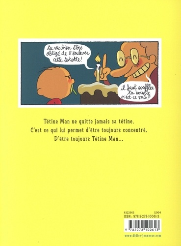 Voici réunies en un seul volume, sept histoires du héros à tétine des 3-6 ans ! Qu'il s'agisse de garder sa place au toboggan, de donner une bonne leçon à mamie, de protéger sa tétine de tous les adultes qui tentent de la lui enlever, Tétine Man trouve toujours une solution !
