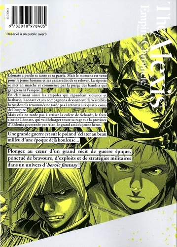 Un récit d'heroic fantasy épique et furieux ! Léonate a perdu sa tante et sa patrie. Mais le moment est venu pour le jeune homme et ses camarades de se relever. La riposte se met en marche et commence par la purge des bandits qui gangrènent l'empire. En éliminant ainsi les crapules qui répandent violence et barbarie, Léonate et ses compagnons deviennent de véritables héros dont la renommée ne tarde pas à retentir aux quatre coins de l'empire. Mais cela ne tarde pas à attiser la colère de Schardt, le frère aîné de Léonate, qui va décharger toute sa rage sur la province d'Eïdonia gouvernée par Alan, le grand ami du jeune héros. Une grande guerre est sur le point d'éclater au beau milieu d'une époque déjà houleuse... Plongez au coeur d'un grand récit de guerre épique, ponctué de bravoure, d'exploits et de stratégies militaires dans un univers d'heroic fantasy !