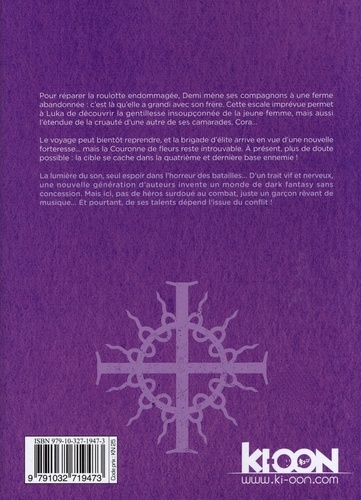 Transcender le fracas des armes, décider du sort de la bataille ! Pour réparer la roulotte endommagée, Demi mène ses compagnons à une ferme abandonnée : c'est là qu'elle a grandi avec son frère. Cette escale imprévue permet à Luka de découvrir la gentillesse insoupçonnée de la jeune femme, mais aussi l'étendue de la cruauté d'une autre de ses camarades, Cora... Le voyage peut bientôt reprendre, et la brigade d'élite arrive en vue d'une nouvelle forteresse... mais la Couronne de fleurs reste introuvable. A présent, plus de doute possible : la cible se cache dans la quatrième et dernière base ennemie ! La lumière du son, seul espoir dans l'horreur des batailles... D'un trait vif et nerveux, une nouvelle génération d'auteurs invente un monde de dark fantasy sans concession. Mais ici, pas de héros surdoué au combat, juste un garcon rêvant de musique... Et pourtant, de ses talents dépend l'issue du conflit !