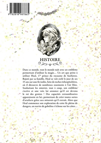 Exilé sur une île hostile, le prince banni devra apprendre à survivre à la force de sa pioche ! Dans ce monde, tout le monde naît avec un emblème permettant d'utiliser la magie... Un art que peine à utiliser Heal, 17e prince du royaume de Sanfaress. Rejeté par sa famille, Heal se voit exilé le jour de ses 15 ans sur une île isolée, faite de roches inhospitalières, où il découvre de nombreux ossements à l'air libre. Souhaitant les enterrer, tout à coup, son emblème s'active et une voix lui annonce qu'il est devenu le roi des grottes ! Des capacités extraordinaires apparaissent en lui, permettant de créer toutes sortes d'artefacts grâce aux minerais qu'il extrait. Alors que Heal commence son exploration de cette île pleine de dangers, un navire de gobelins s'échoue sur les côtes...