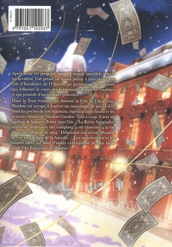 Il est prêt à tout pour devenir une Eminence de l'ombre... mais ses plus gros mensonges vont le rattraper ! Après avoir été propulsé dans un monde parallèle suite à un accident, Cid prend un malin plaisir à interpréter son rôle d'Eminence de l'Ombre, un personnage mystérieux qui influence le cours des événements depuis les coulisses et qui possède d'incroyables pouvoirs. Deux puissances économiques se partagent les activités commerciales de la capitale royale : la société de négoce Mitsugoshi et la Chambre de Commerce. Mais lorsque la concurrence entre elles s'intensifie, Cid décide de provoquer leur faillite en se créant un nouvel alter ego : John Smith, super agent d'élite de son état ! Et comme à son habitude, il justifie ce geste qui risque d'être interprété comme une trahison de Shadow Garden en inventant un scénario ahurissant : pour sauver Mitsugoshi, il faut d'abord la mettre à terre avec classe ! Les malentendus et les fausses idées sur fond d'isekai s'enchaînent de plus belle dans ce neuvième volume de The Eminence in Shadow !