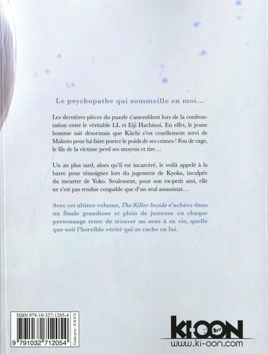 Le psychopathe qui sommeille en moi... Les dernières pièces du puzzle s'assemblent lors de la confrontation entre le véritable LL et Eiji Hachinoi. En effet, le jeune homme sait désormais que Kiichi s'est cruellement servi de Makoto pour lui faire porter le poids de ses crimes ! Fou de rage, le fils de la victime perd ses moyens et tire... Un an plus tard, alors qu'il est incarcéré, le voilà appelé à la barre pour témoigner lors du jugement de Kyoka, inculpée du meurtre de Yoko. Seulement, pour son ex-petit ami, elle ne s'est pas rendue coupable que d'un seul assassinat... Avec cet ultime volume, The Killer Inside s'achève dans un finale grandiose et plein de justesse où chaque personnage tente de trouver un sens à sa vie, quelle que soit l'horrible vérité qui se cache en lui.